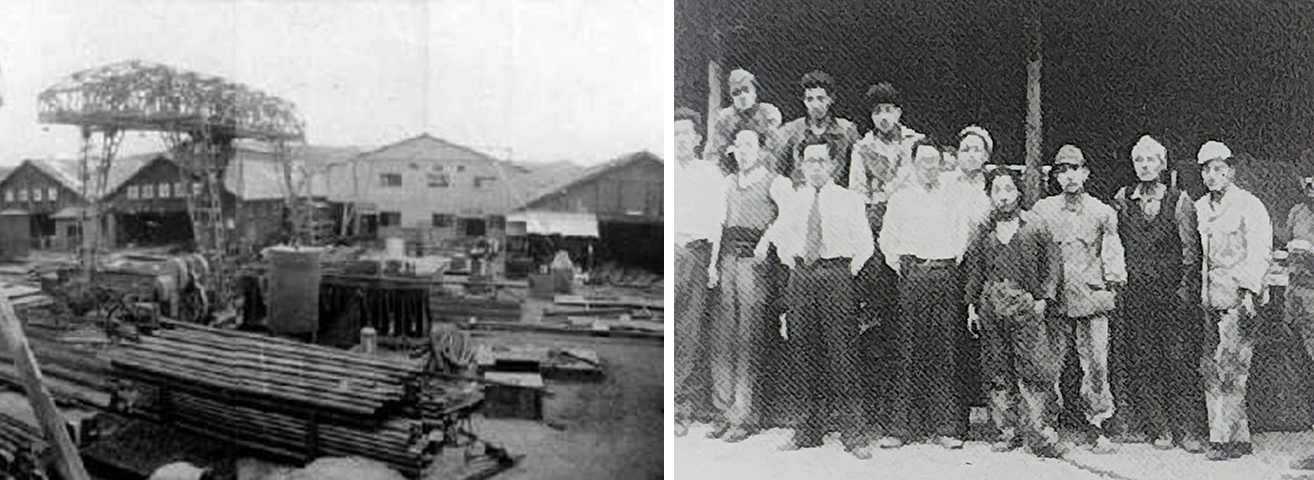 宇部製缶工業㈲に商号を変更。写真は宇部製缶工業㈲工場全景と当時の社員。