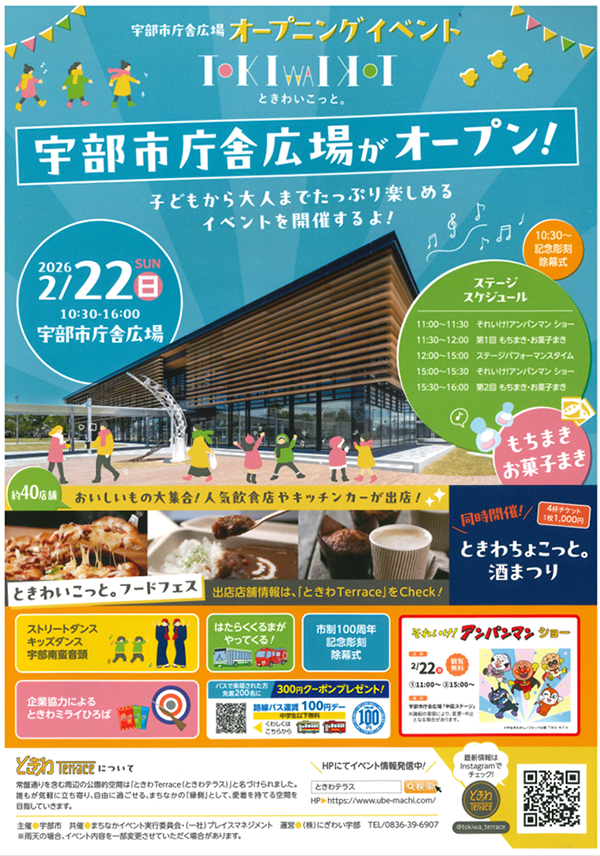 2月22日(日)10:30より、宇部市庁舎広場にて「宇部市庁舎広場オープニングイベントときわいこっと。」が開催されます。