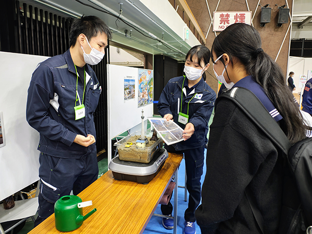 屋内ブースでは弊社の仕事をまとめたイラストなどを用いた会社説明や、弊社が施工に携わった宇部市役所建て替え工事の紹介を行いました(写真①)。また町を模擬的に再現した実験装置では、地震に見立てた振動を加え、液状化現象を実演しました(写真②)。