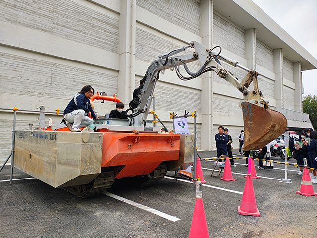 屋外ブースではオランダから輸入した日本に1台しかない水陸両用小型作業船「CONVER(コンバー)」の実機を展示しました。弊社社員付き添いのもとアームを操作し、ペットボトルの上に置いた小さな的をバケット部分で落とすというミニゲーム形式で操作体験をしていただきました(写真③)。