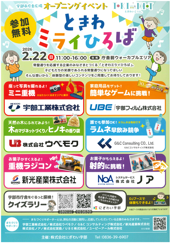 2月22日(日)10:30より、宇部市庁舎広場にて「宇部市庁舎広場オープニングイベントときわいこっと。」が開催されます。